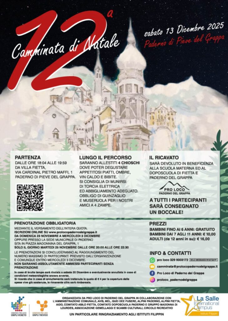 Si partirà da Villa Fietta a Paderno di Pieve del Grappa dalle ore 18.04 alle 19.59. Come da tradizione, la Camminata si snoderà lungo le contrade più conosciute del paese e vi faremo scoprire le bellezze più nascoste che il nostro territorio ci offre… tutto questo logicamente immerso nel magico e incantevole clima del Natale. Lungo il percorso saranno allestiti quattro chioschi in cui sarete deliziati con gustosissimi piatti e bibite calde preparati dalle nostre fedeli e indispensabili associazioni paesane.
